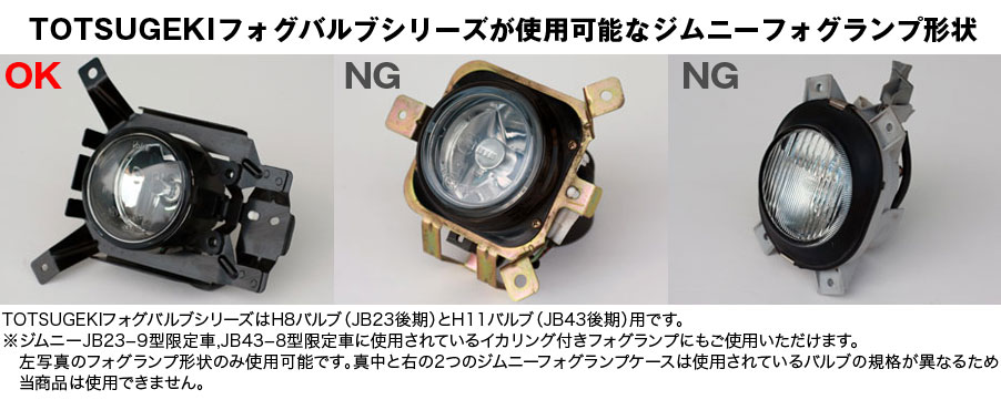 ※JB23前期型やJB33に使用されている旧タイプフォグランプはバルブ規格が異なるためご使用いただけません。
